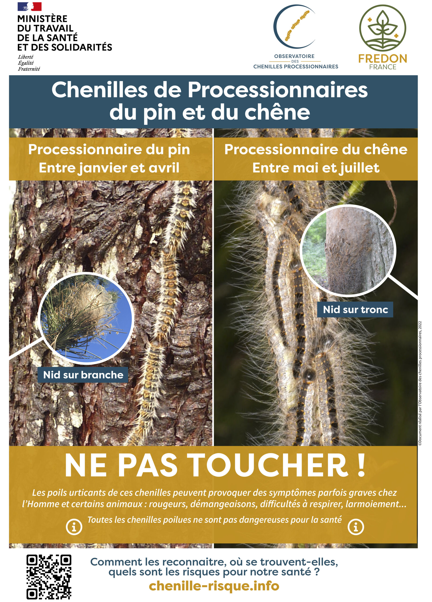 - N’approchez pas et ne touchez pas les chenilles, leur nid ou les arbres porteurs de nid et gardez les enfants éloignés.