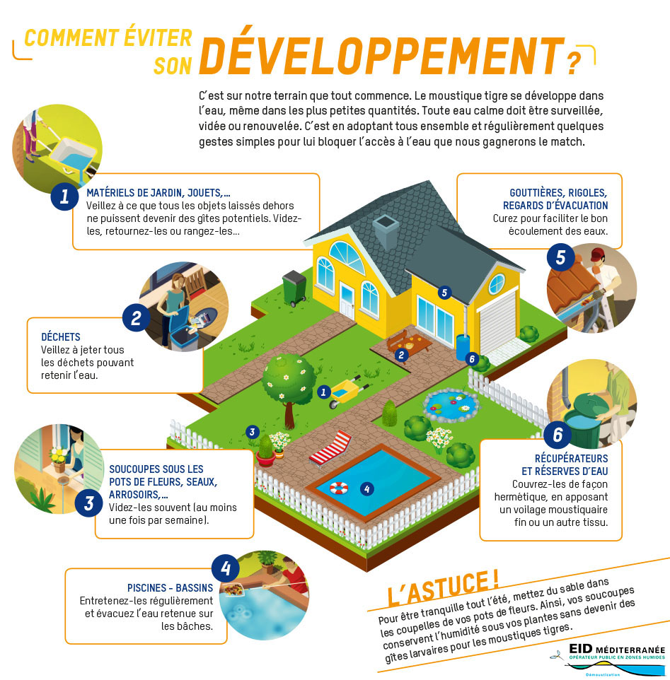 La façon la plus efficace de se protéger de ces nuisances en amont, c’est ranger, curer, protéger, couvrir (toiles moustiquaires) ou évacuer les eaux stagnantes. Ou, mieux encore : chaque fois que possible, supprimer physiquement ces gîtes.