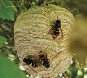 De plus en plus présent en France, le Frelon asiatique constitue une menace pour les écot-systèmes et particulièrement les ruchers. Ses nids, en forme de grosse boule de la taille d’un ballon de football voire plus, se trouve le plus souvent en hauteur dans les arbres et ne deviennent souvent visibles qu’en automne à la chute des feuilles. Toutefois ce frelon peut aussi s’installer dans des haies de feuillus, ce qui peut constituer un véritable danger lors de tout travaux d’élagage ou de passage de public à proximité