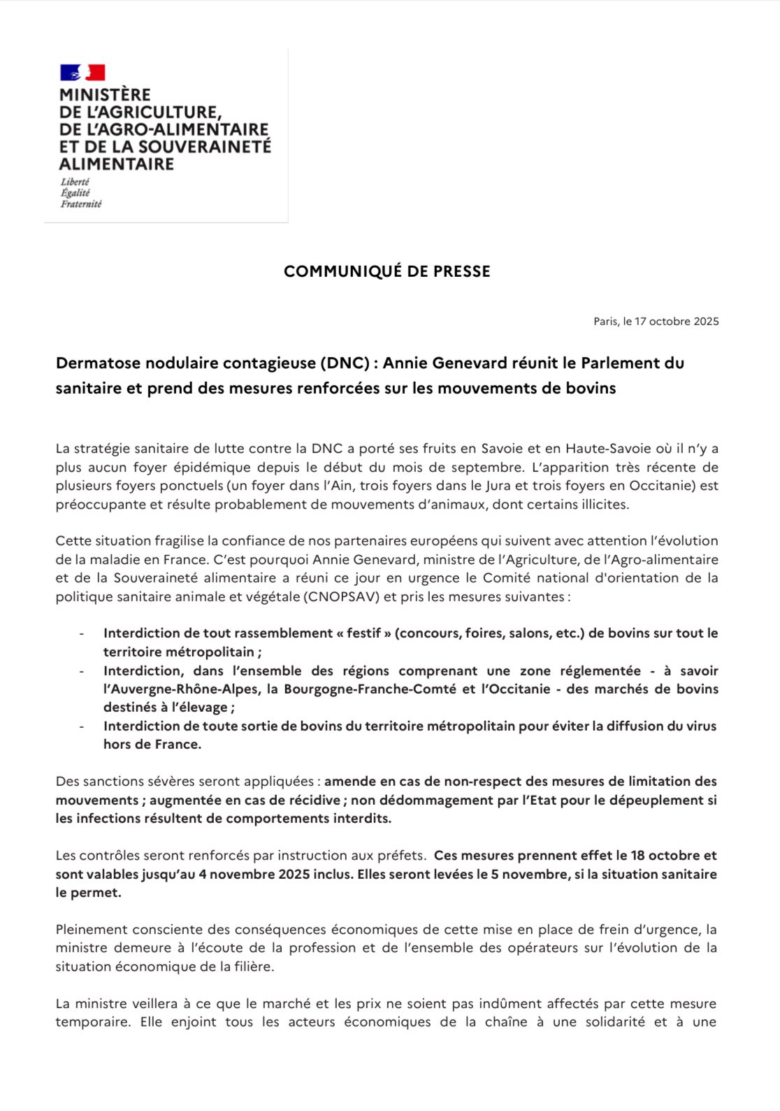 PAR ARRÊTÉ MINISTÉRIEL DÛ 17 OCTOBRE, LE MINISTÈRE DE L’AGRICULTURE A PRIS DES MESURES CONTRAIGNANTES DONT L’INTERDICTION DE TOUT RASSEMBLEMENT « FESTIF » DE BOVINS SUR TOUT LE TERRITOIRE MÉTROPOLITAIN.