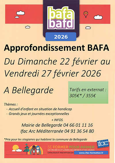 •  du dimanche 22 au vendredi 27 février 2026 : une formation d’approfondissement permettant aux jeunes stagiaires BAFA de finaliser leur parcours et d’obtenir le diplôme. Thèmes de travail : “L’accueil d’enfant en situation de handicap” et “les grands jeux et journées exceptionnelles”