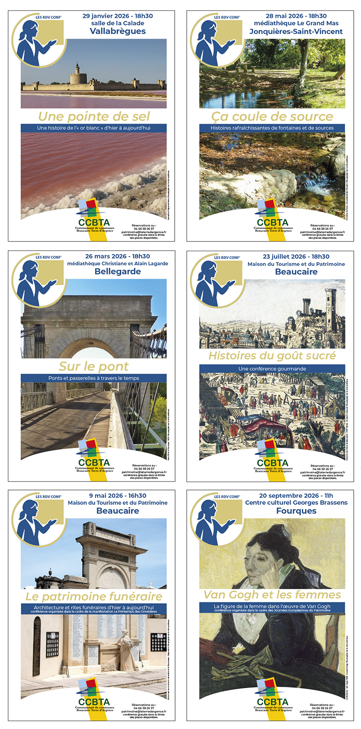 - Le 9 mai – 16h30 à Beaucaire (maison du tourisme et du patrimoine) « le patrimoine funéraire ». A l’occasion de la manifestation « le Printemps des cimetières », cette conférence abordera l’histoire de ce patrimoine à travers l’architecture, la sculpture…